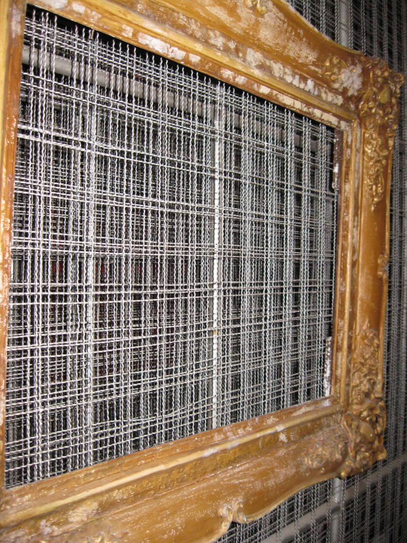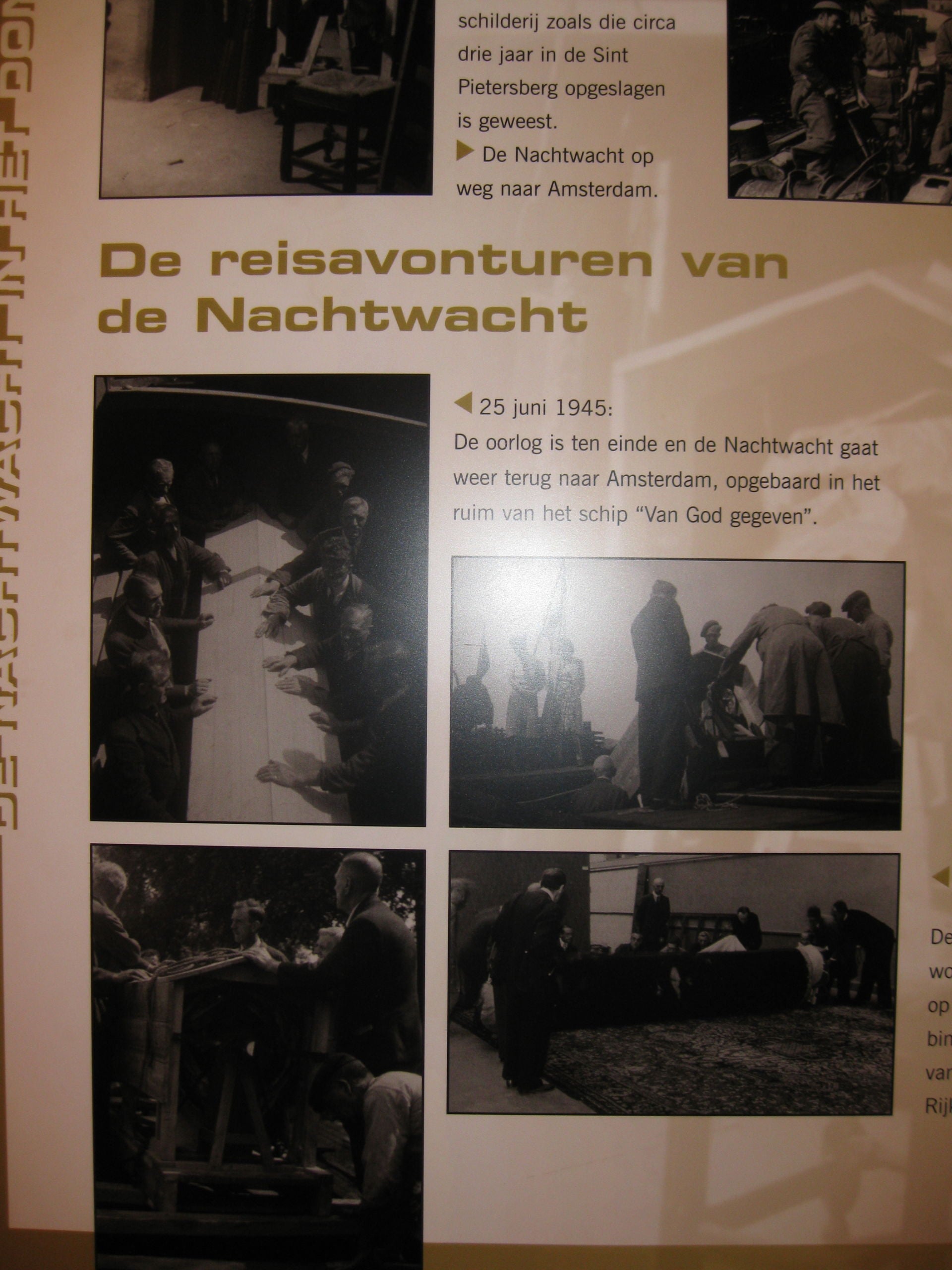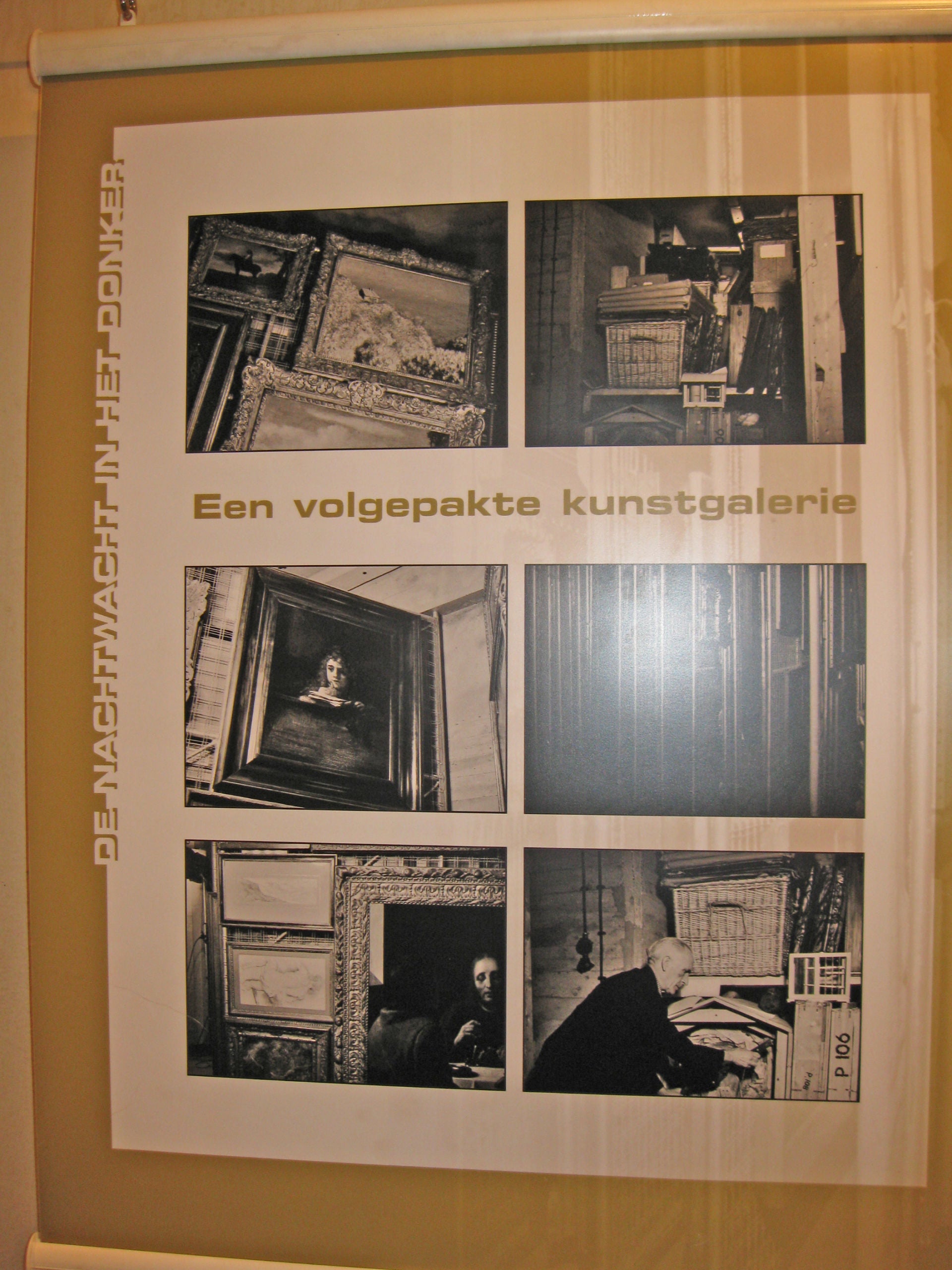 Beneden: De rekken waar de schilderijen werden opgehangen en daarnaast lagen de grote schilderijen, zoals de Nachtwacht, opgerold op deze tafel.